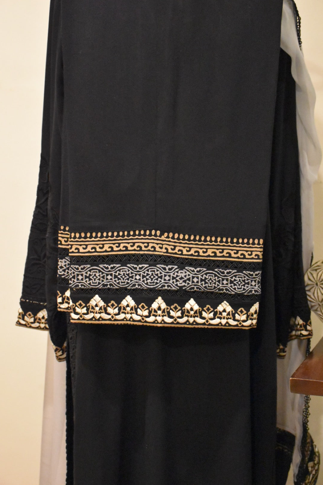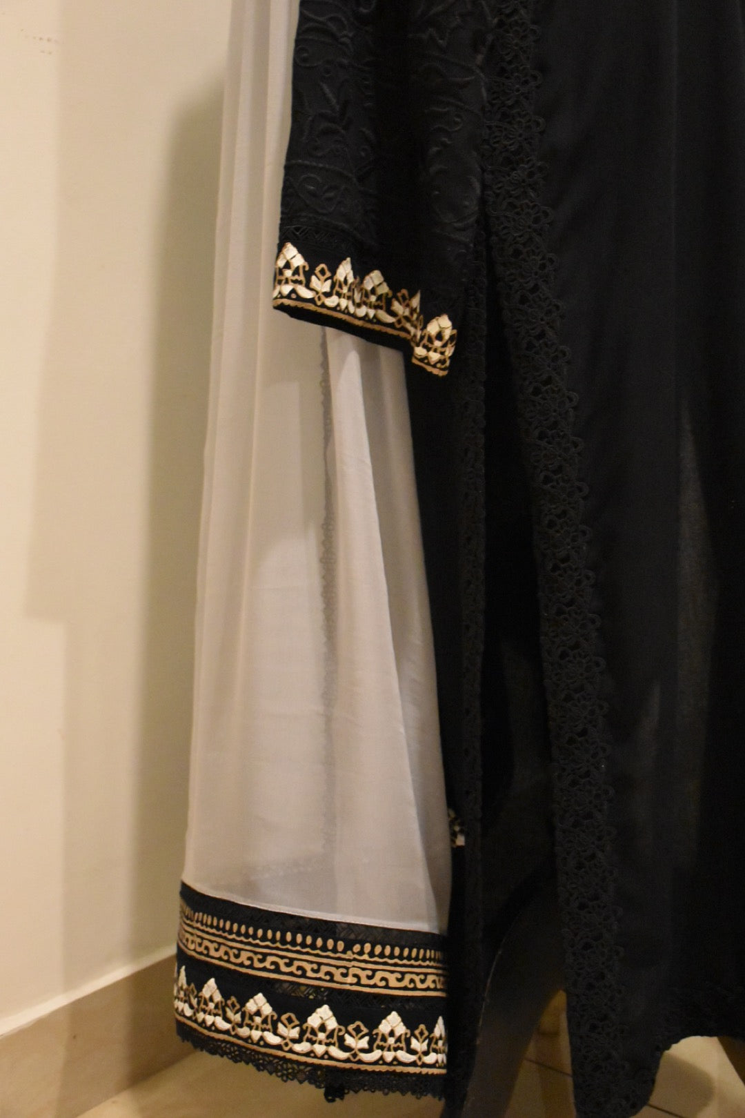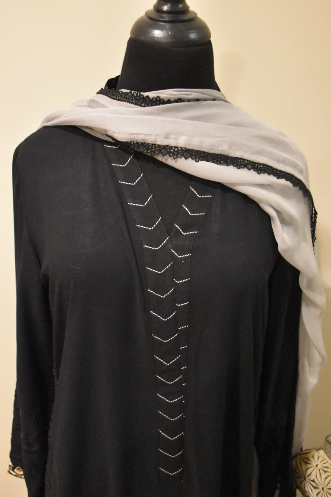 3’ Piece Stitched Outfit. Black Linen Shirt with delicate embroidery on sleaves along with block print finish with laces, paired with block printed pants along with grey chiffon dupatta finished with laces and block print