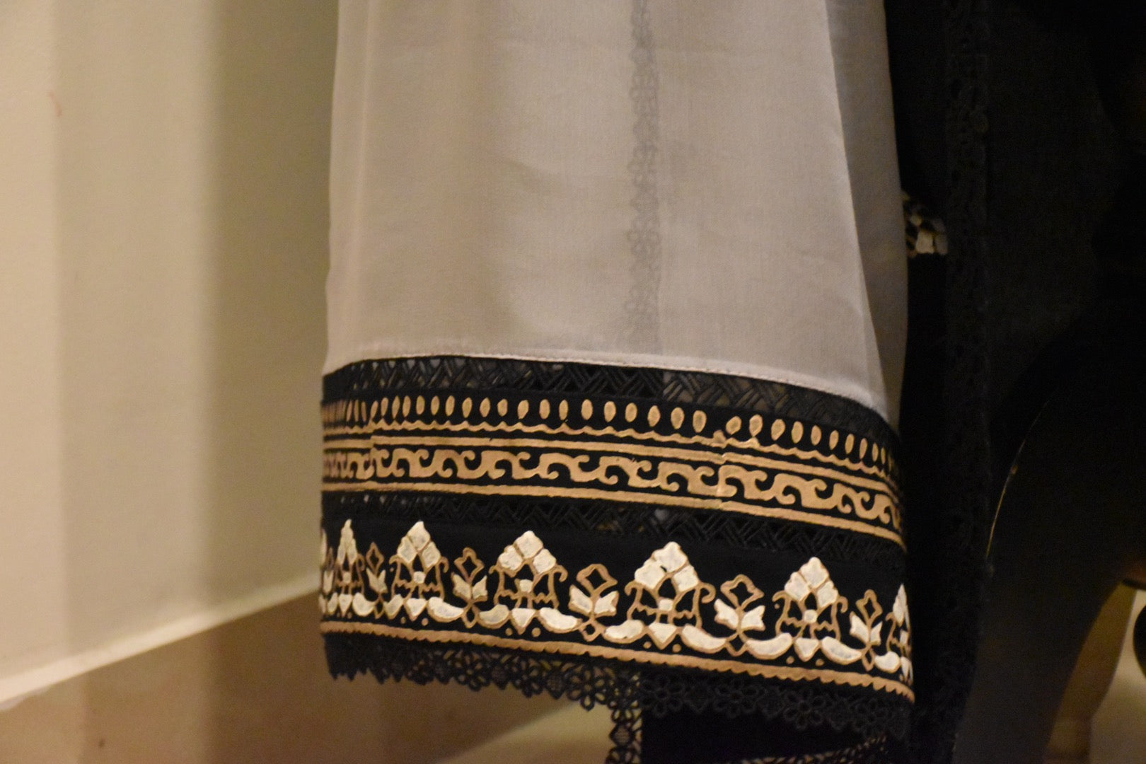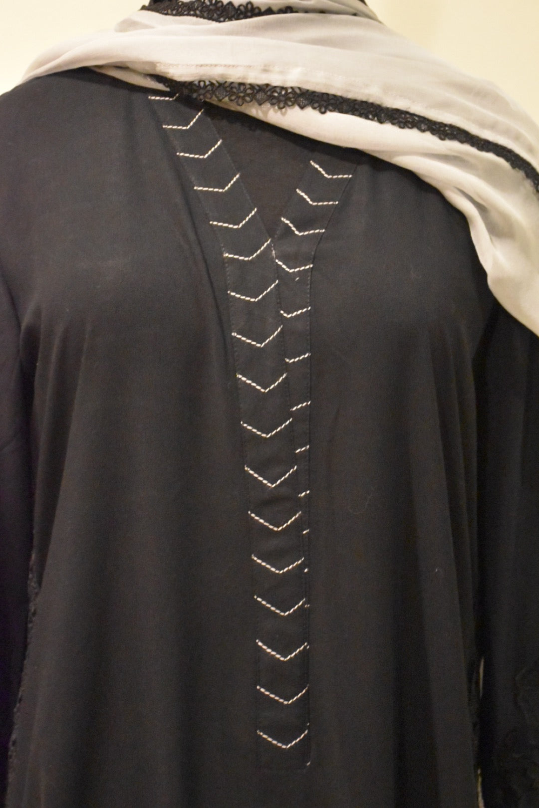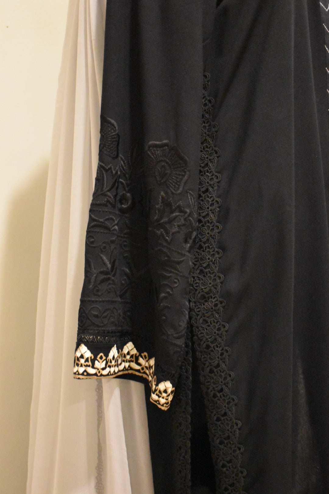 3’ Piece Stitched Outfit. Black Linen Shirt with delicate embroidery on sleaves along with block print finish with laces, paired with block printed pants along with grey chiffon dupatta finished with laces and block print