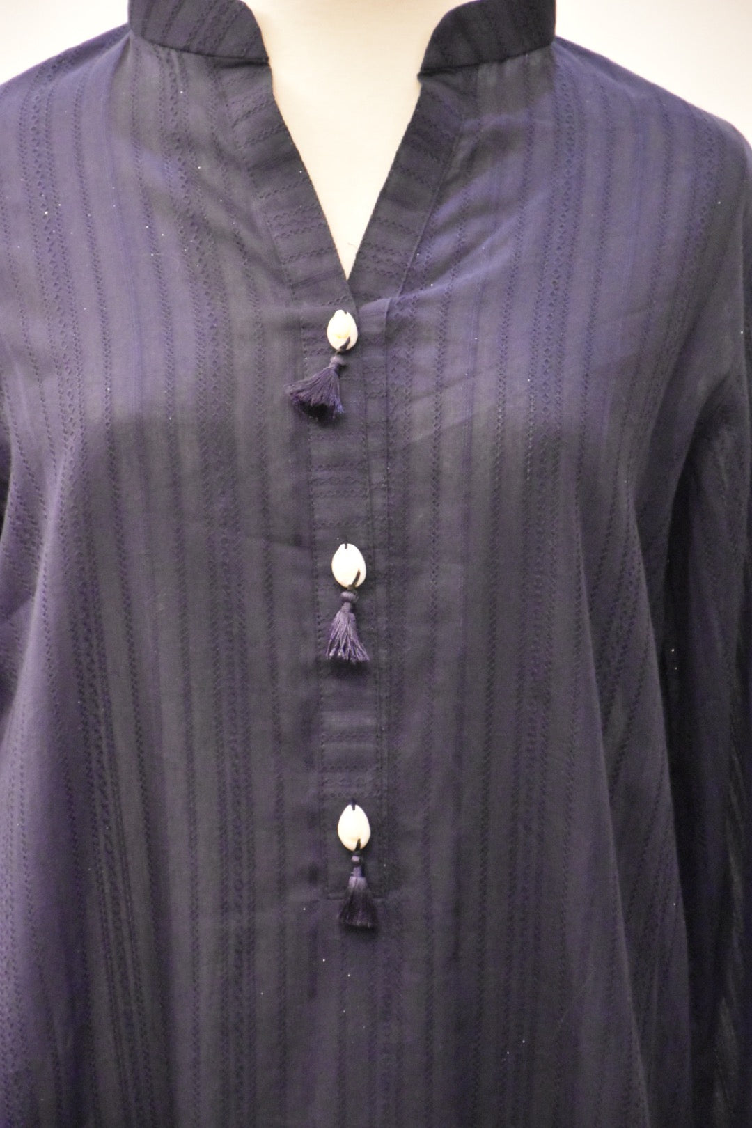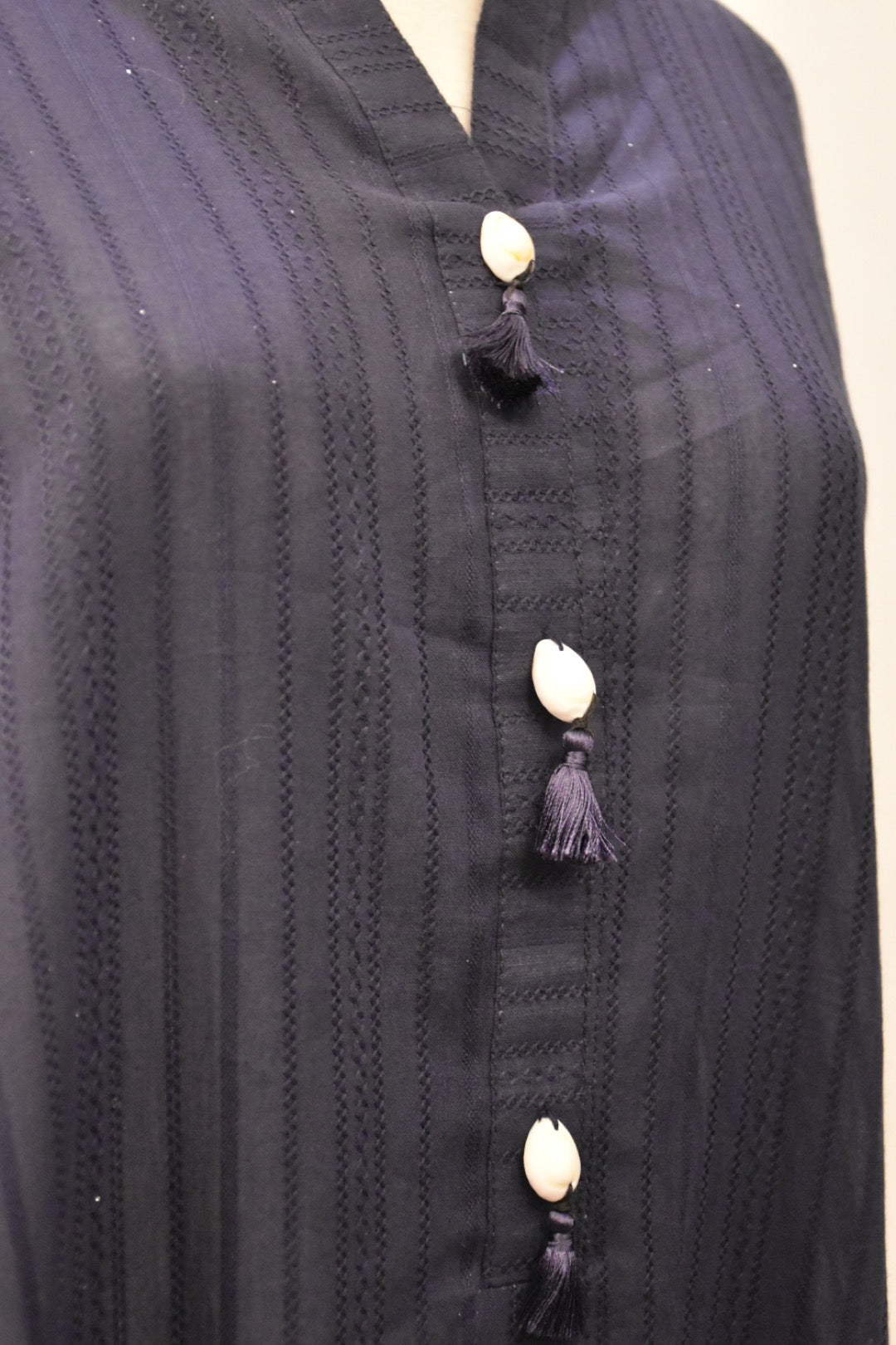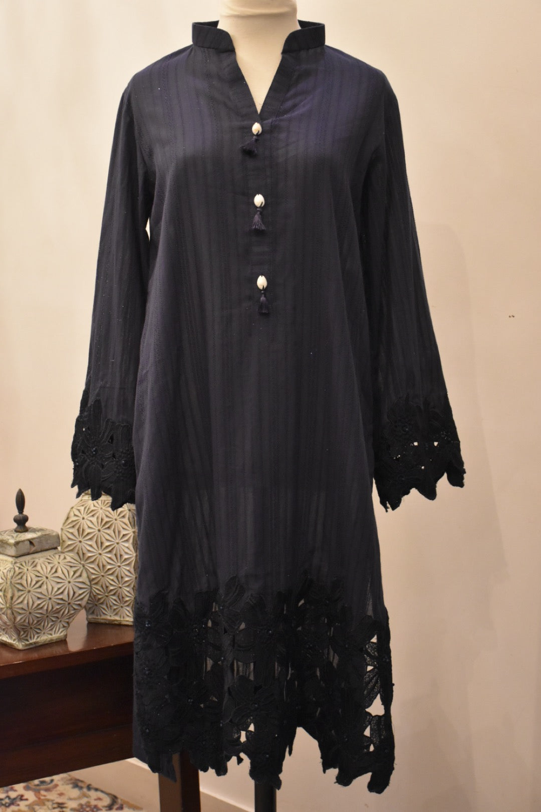 ‘2’ Piece Stitched Outfit. Cotton Navy Blue Shirt with Shell Buttons on neckline and lace applique on Daaman and sleaves paired with plain pants