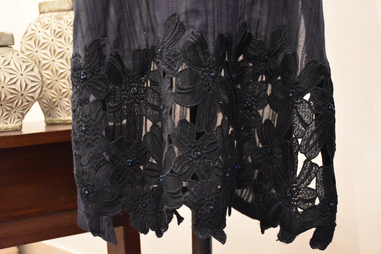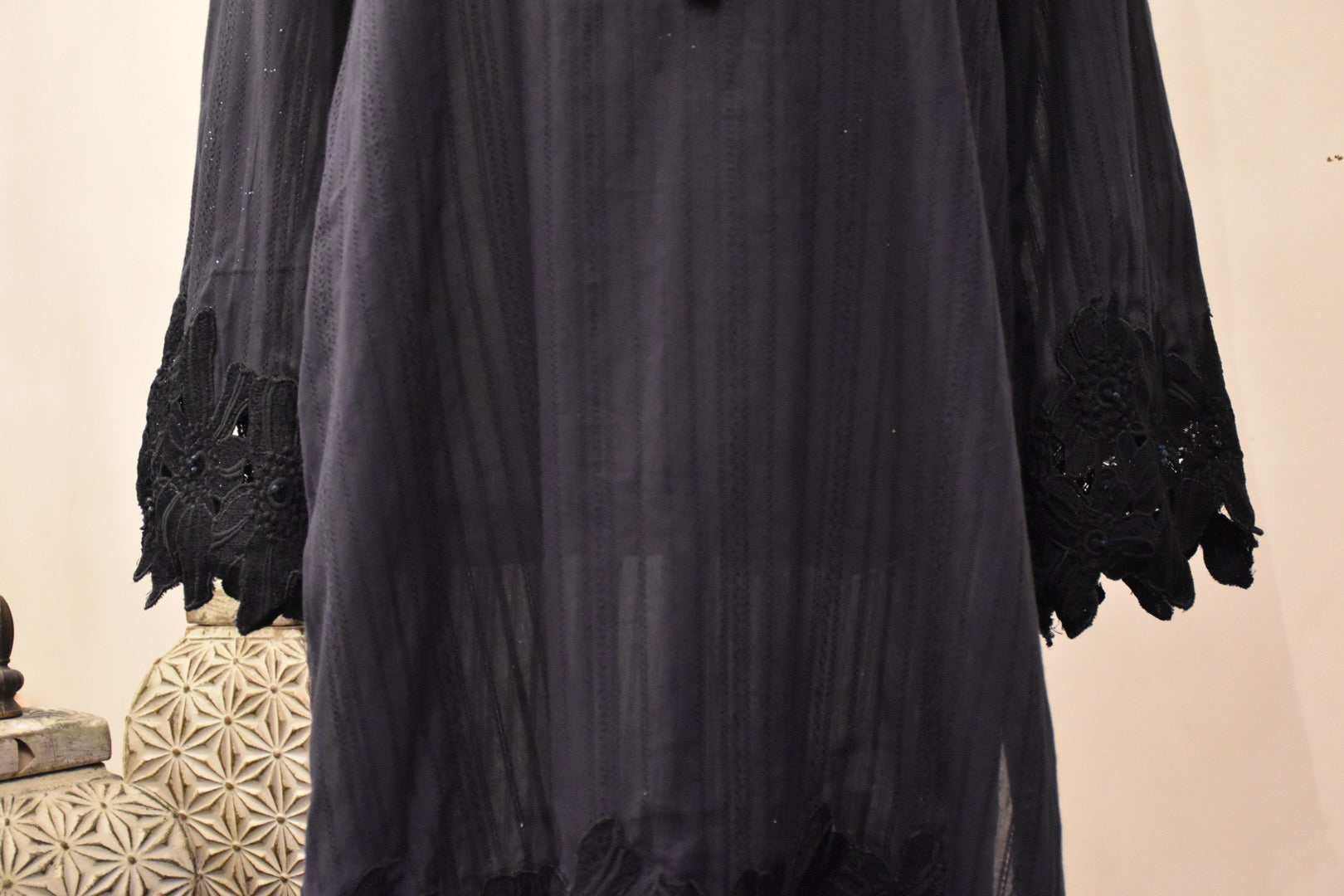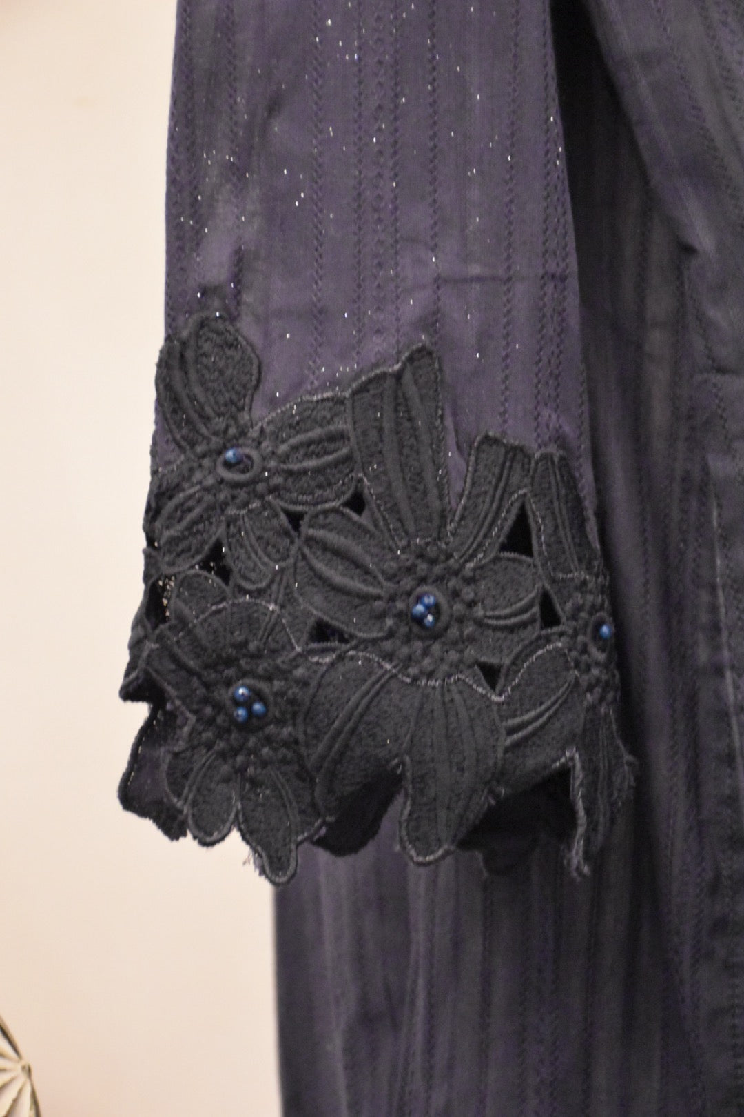 ‘2’ Piece Stitched Outfit. Cotton Navy Blue Shirt with Shell Buttons on neckline and lace applique on Daaman and sleaves paired with plain pants
