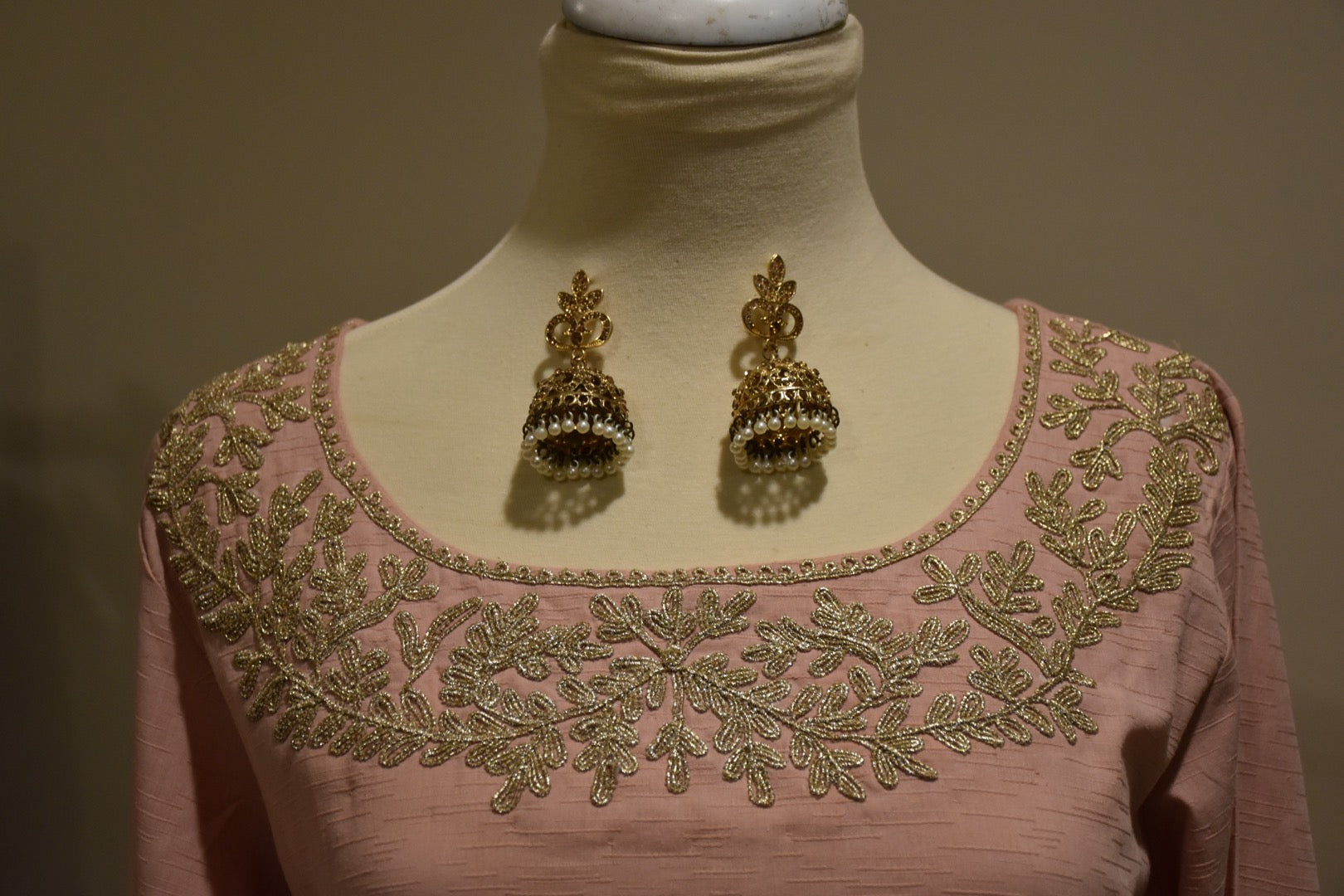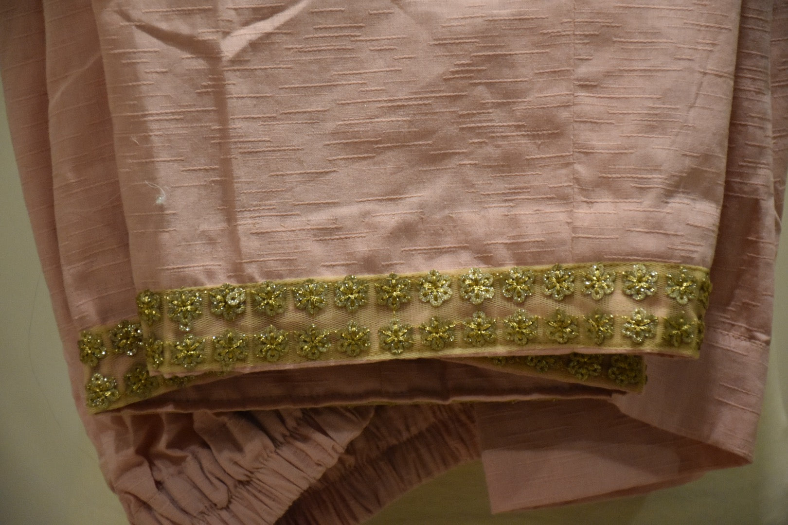 ‘2’ Piece Stitched Outfit. Pink Shirt with Golden Aari Work paired with Self lace finished self pants
