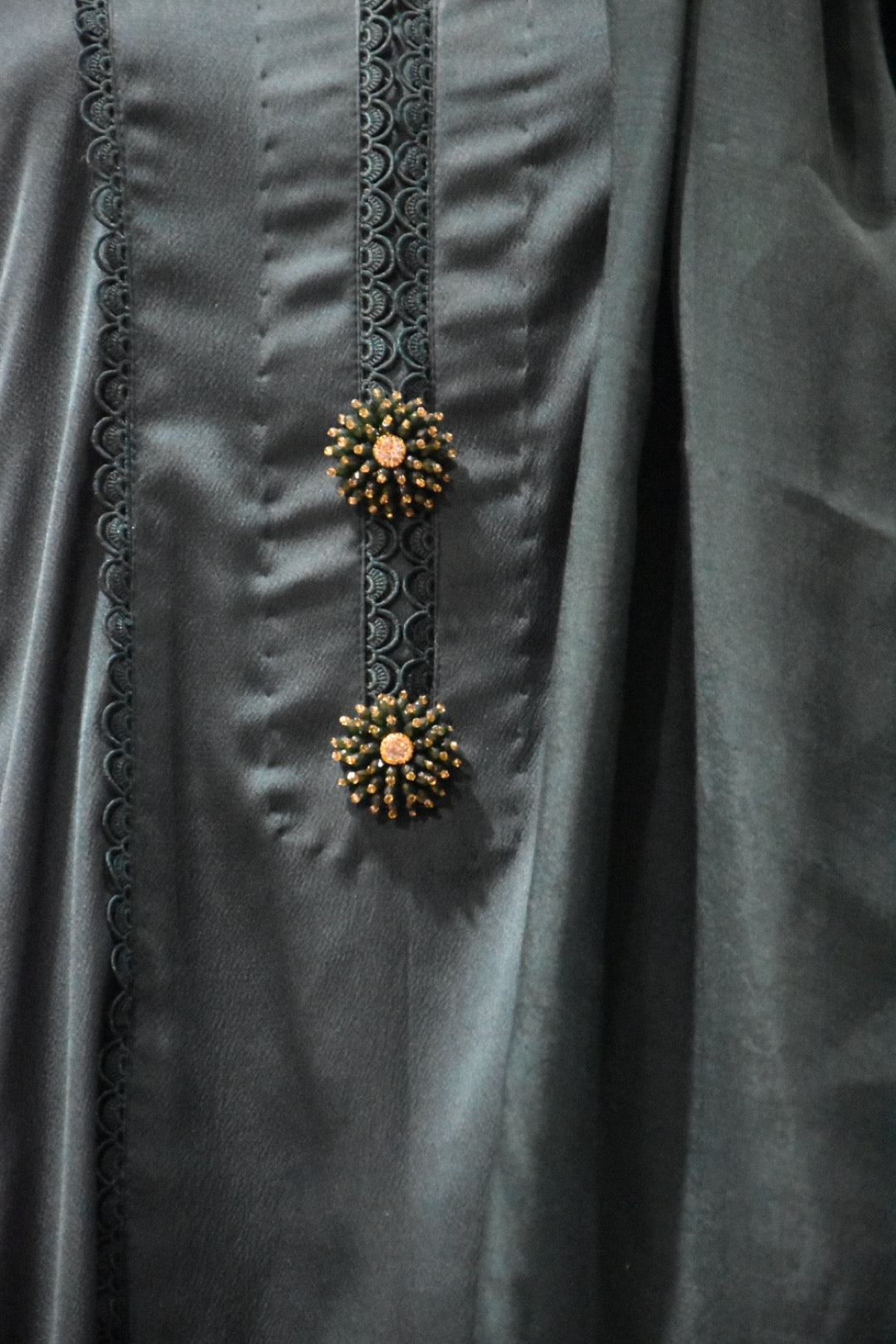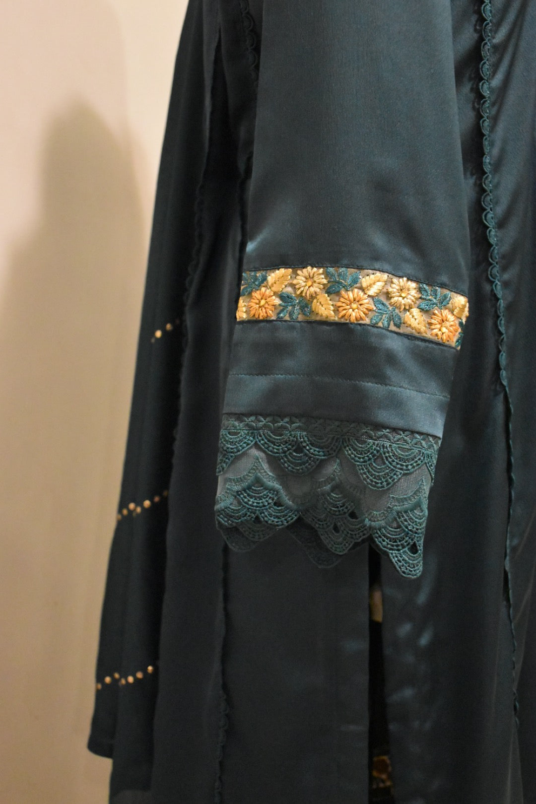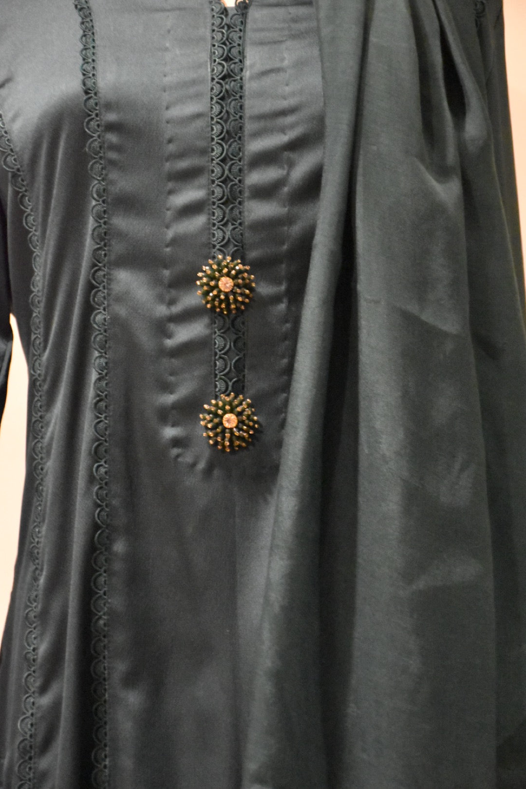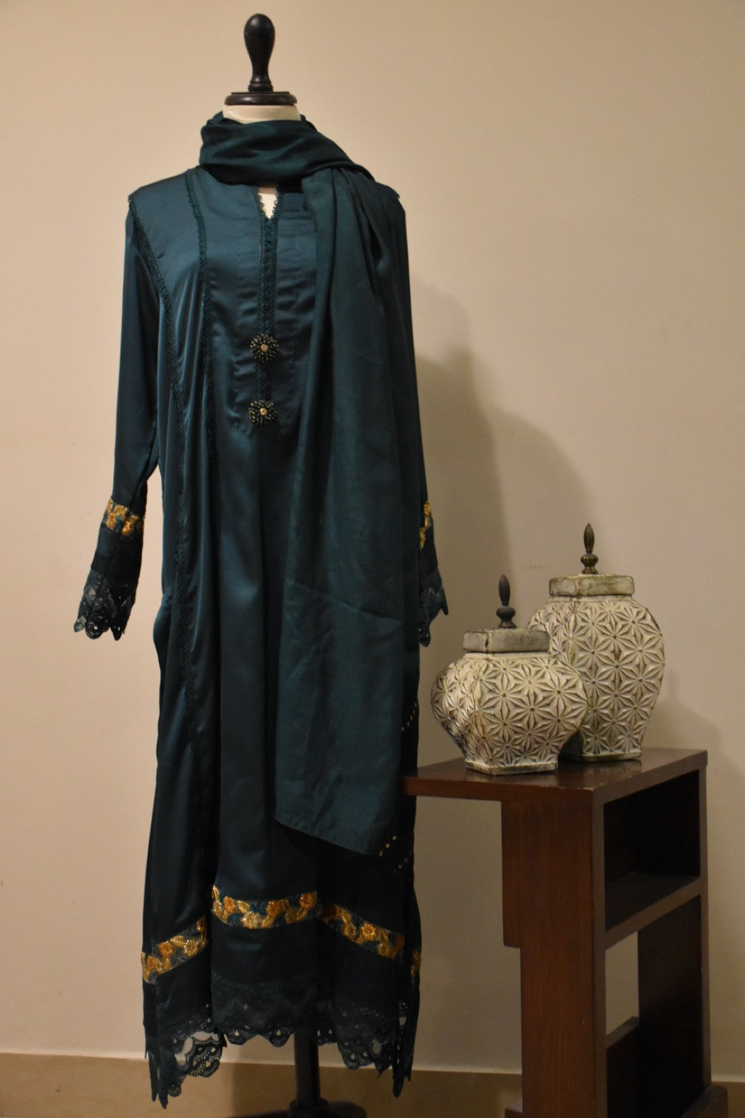 ‘3’ Piece Stitched Outfit. Butter Silk Shirt with Lace Details and Bold Buttons paired with Straight Pants along with Silk Dupatta full of Chan