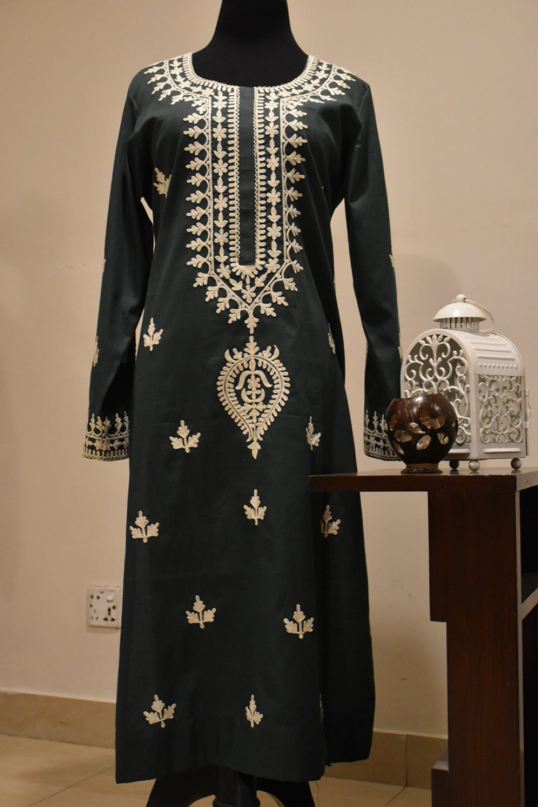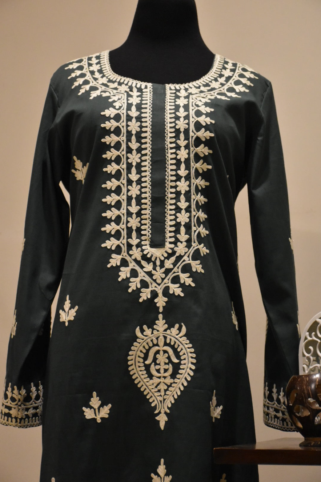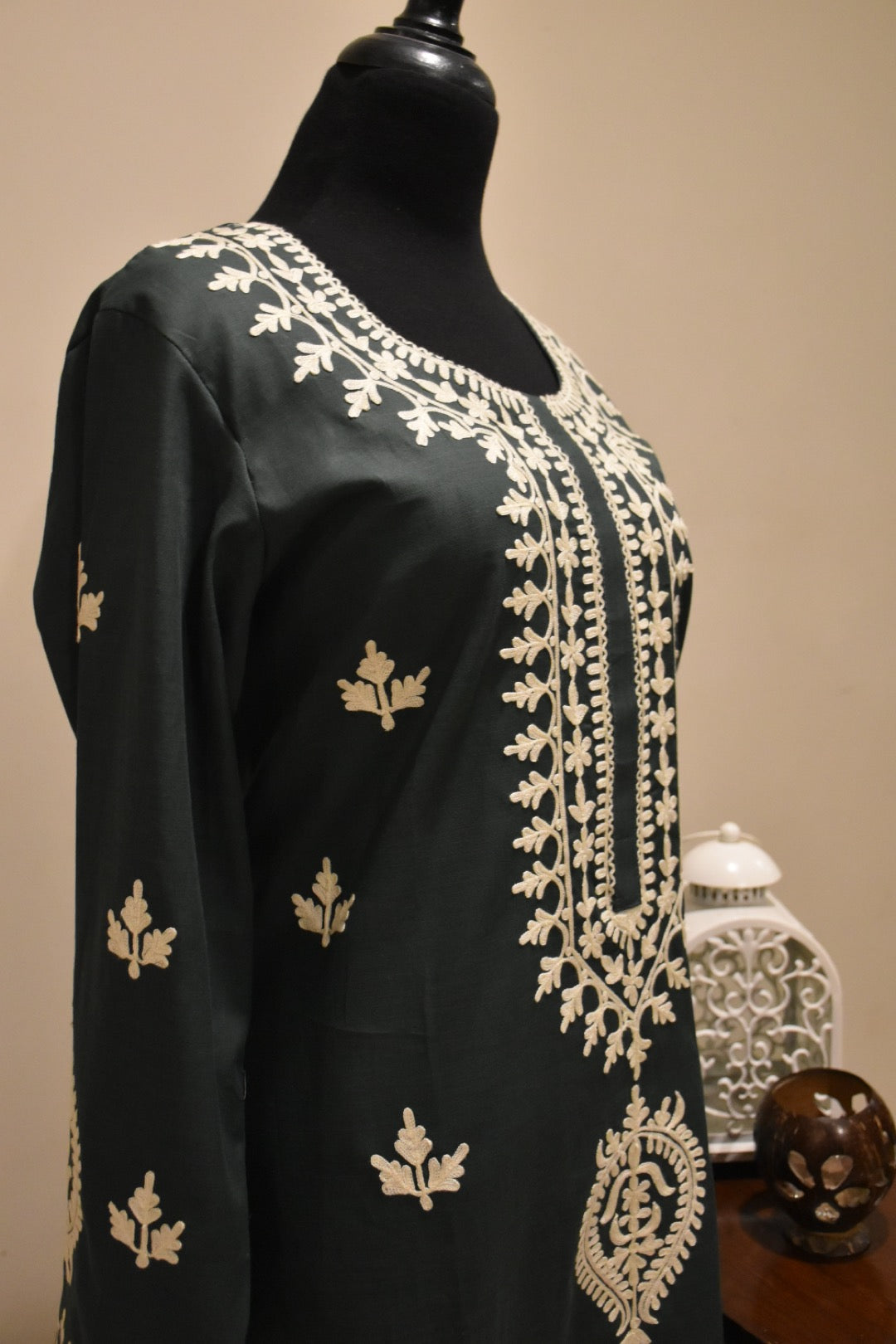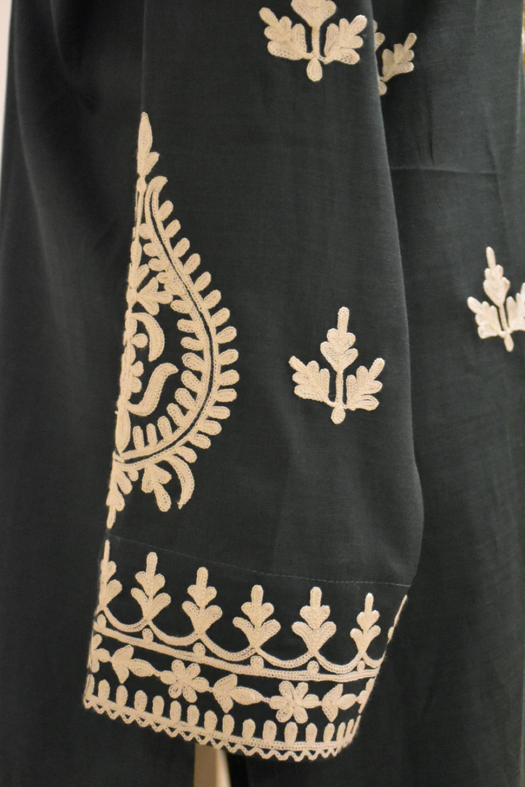 ‘2’ Piece Stitched Outfit. Dark Green shirt with Aari-Work paired with plain pants