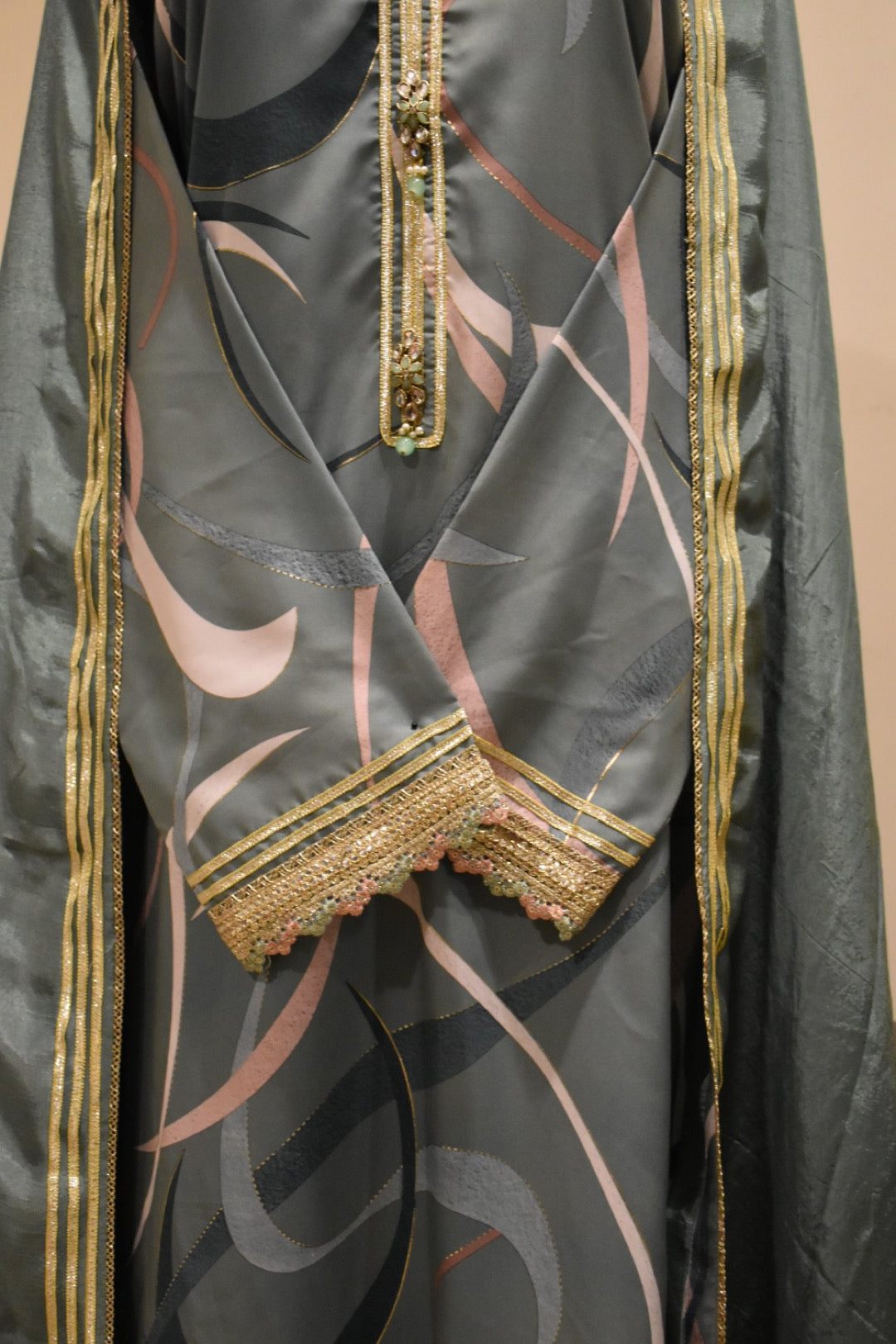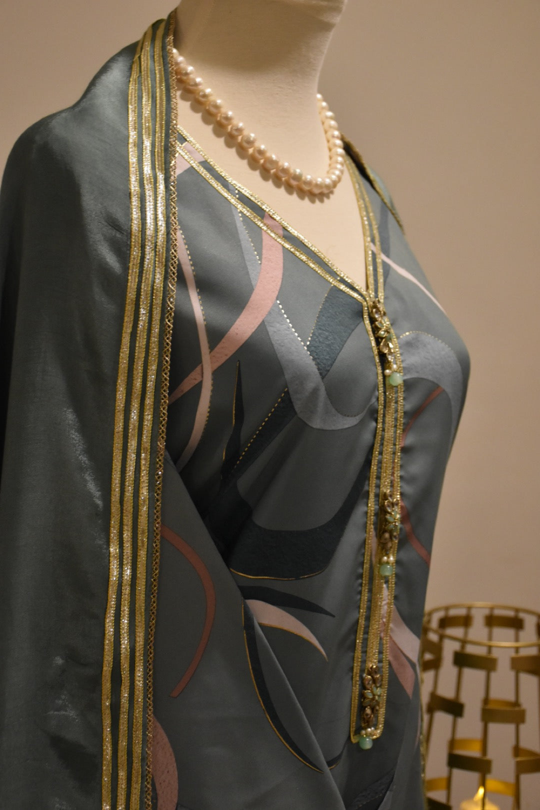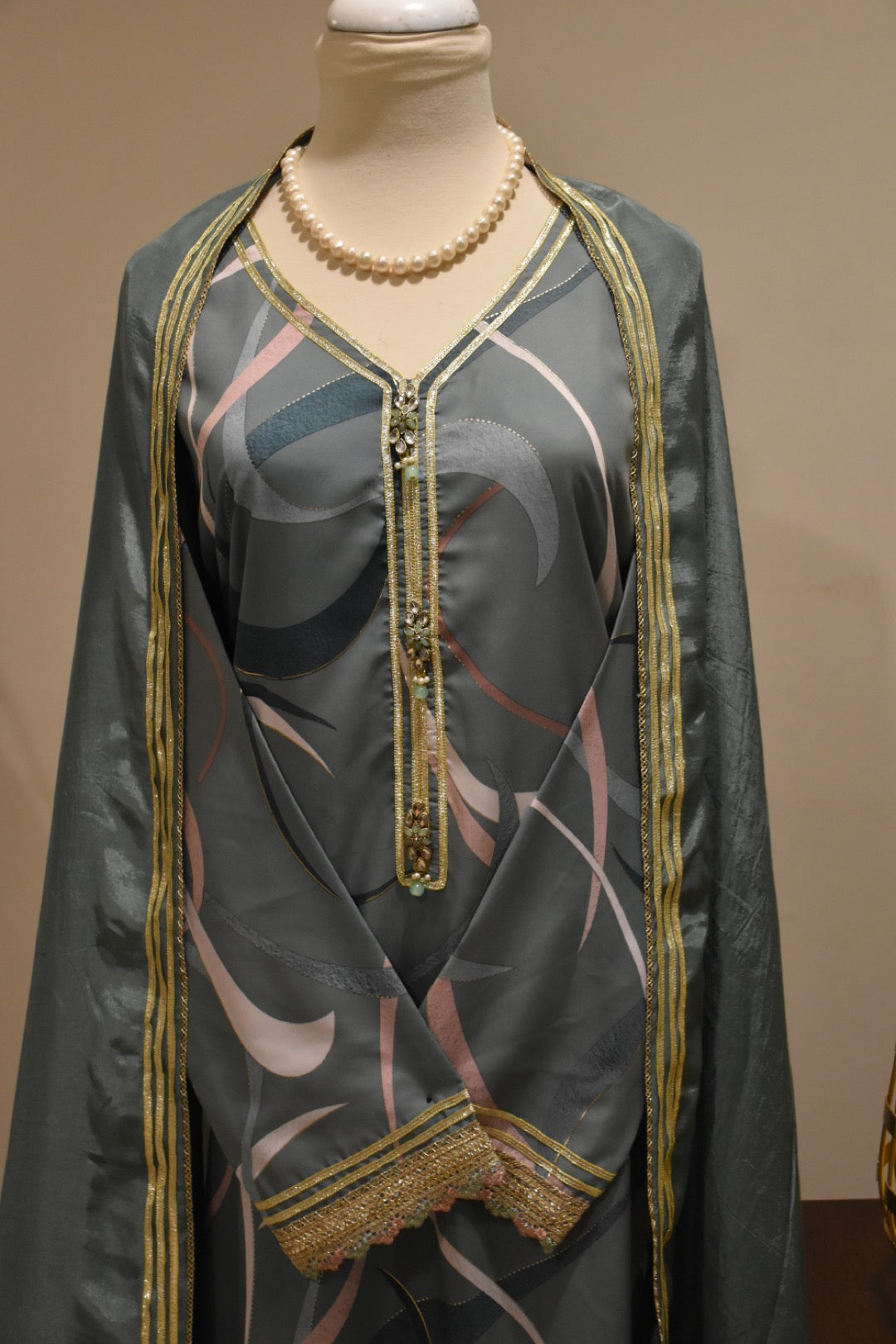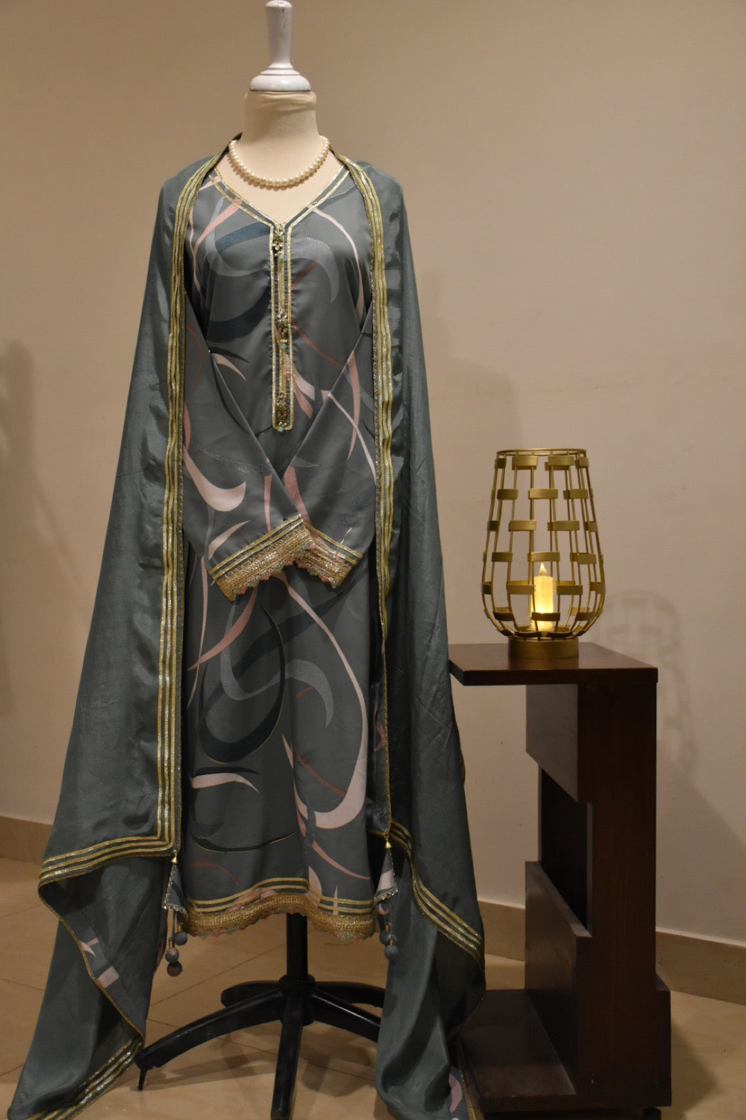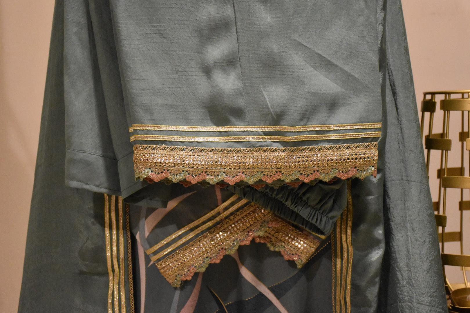 ‘3’ Piece Stitched Outfit. Printed Green Silk shirt with lace finishing paired with Silk pants with Gota finishing along with silk dupatta with laces