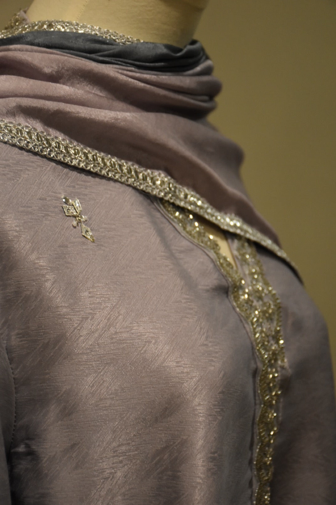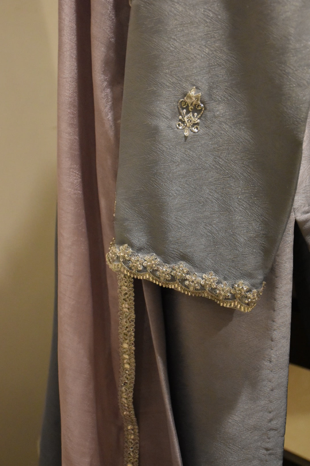 ‘3’ Piece Stitched Outfit. Two Tone Grey Shirt with Gota hand work and finishing on sleaves and neck line paired with self color pants with two tone Silk Dupatta