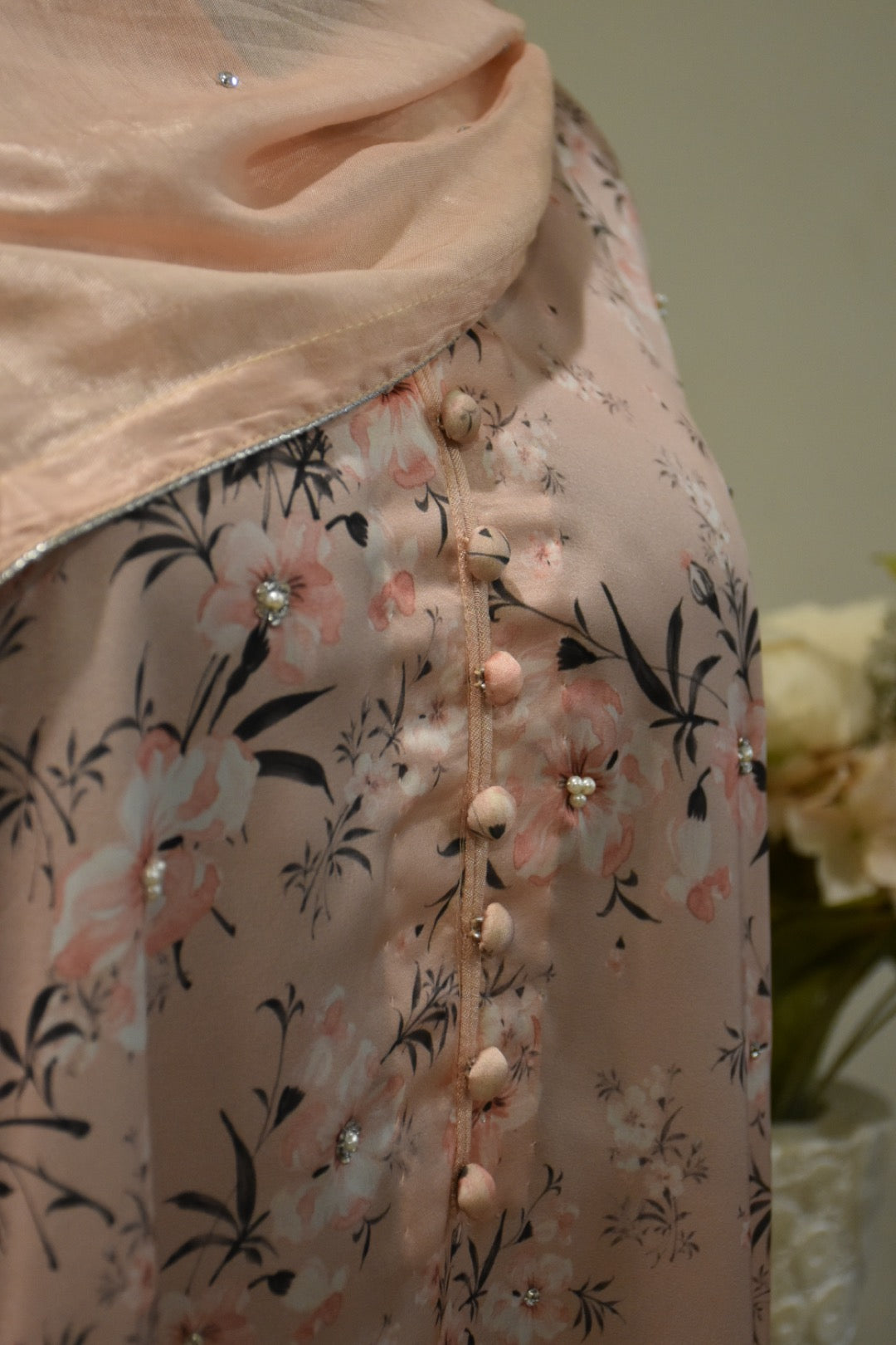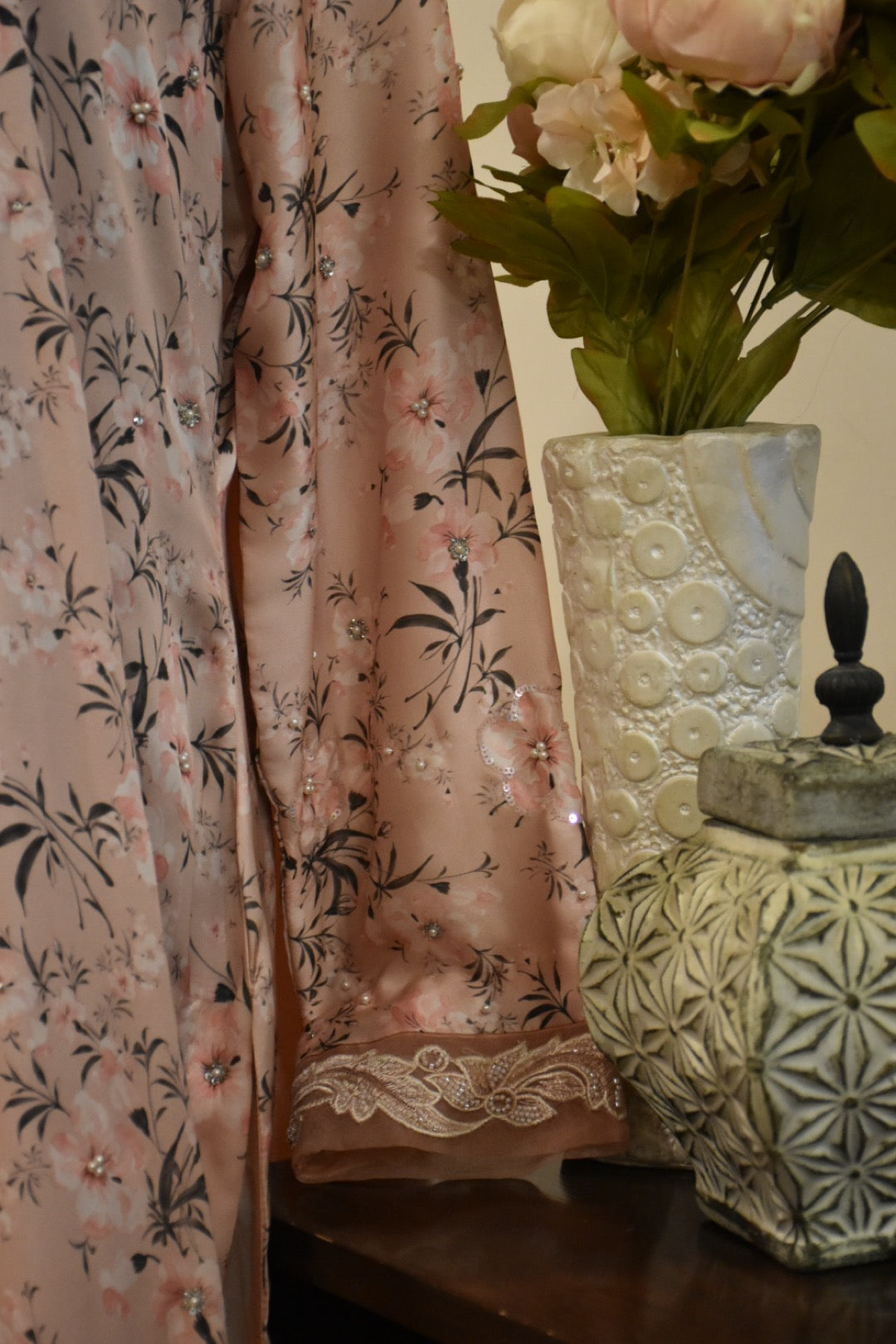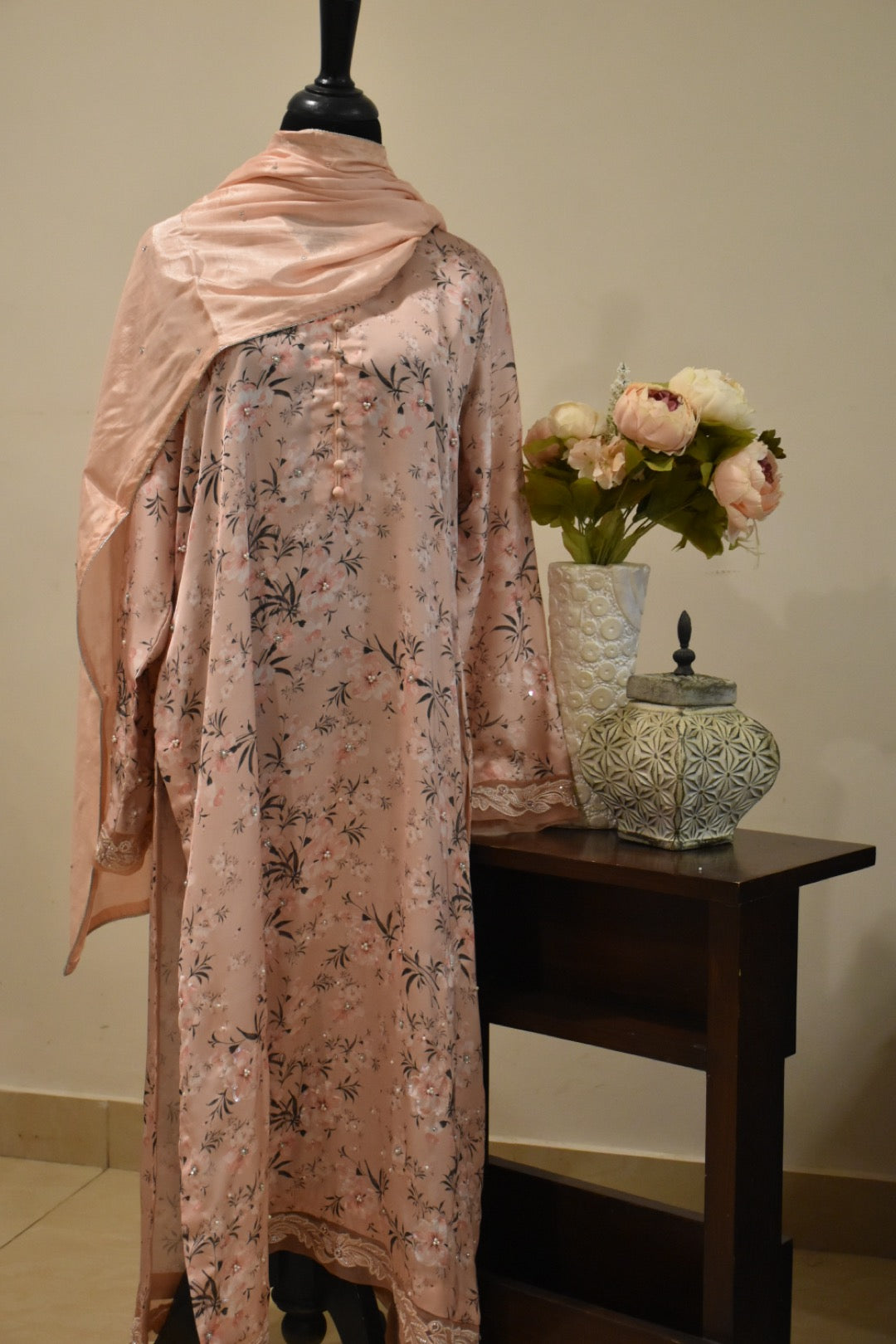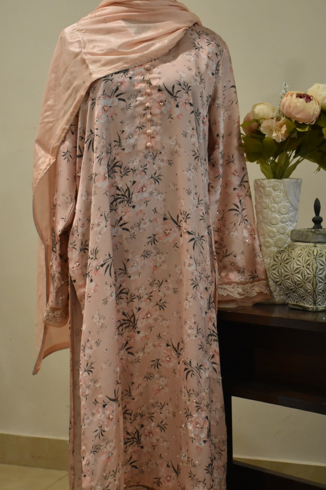 ‘3’ Piece Stitched Outfit with printed Pink Silk Shirt with hand work paired with Raw Silk Pant along with silk dupatta with Chan