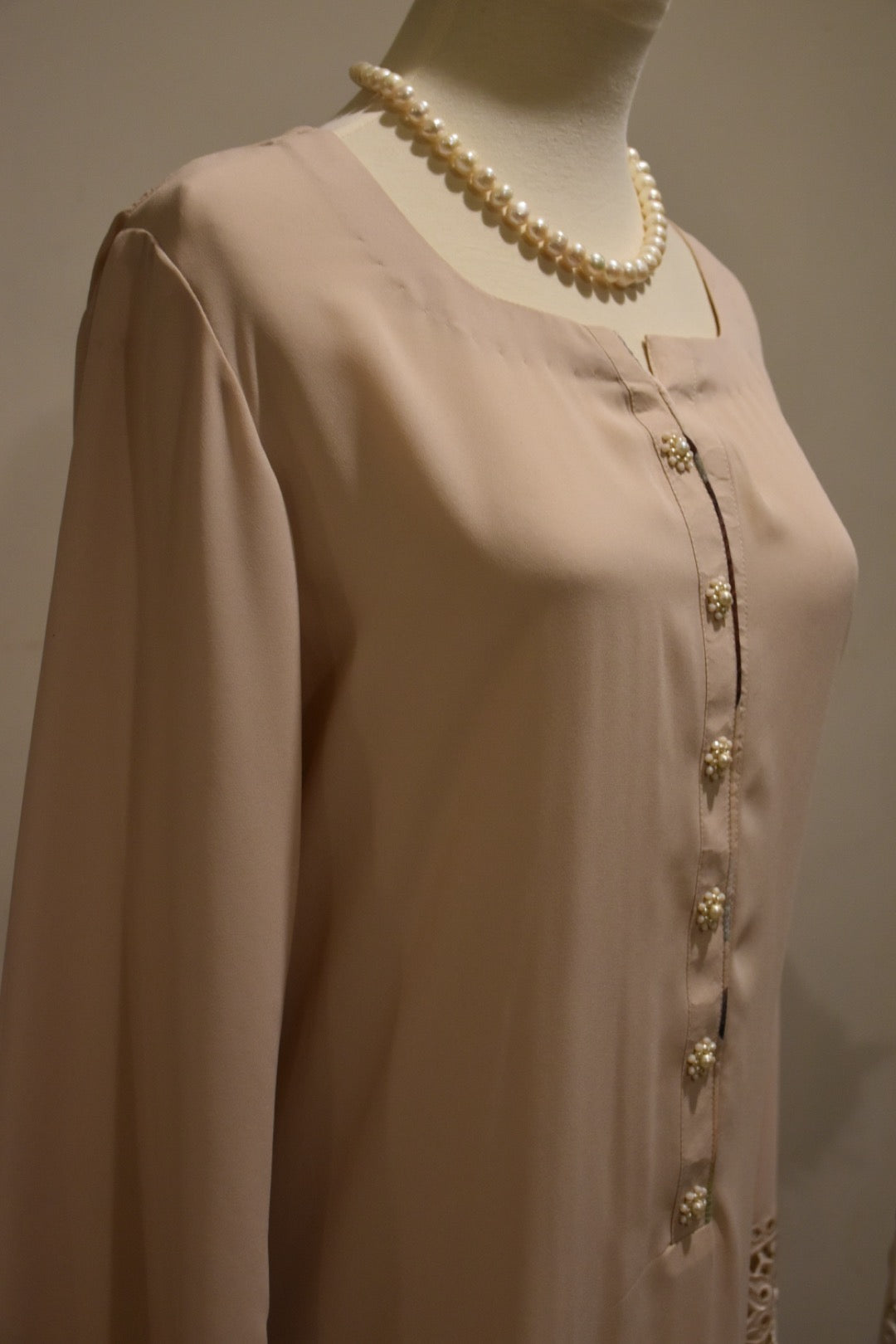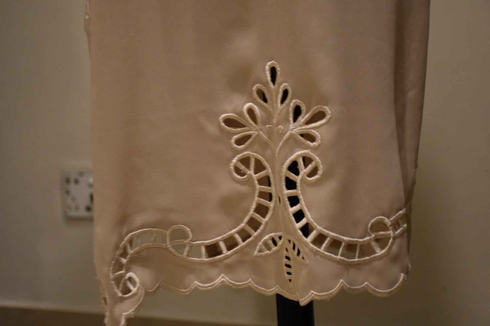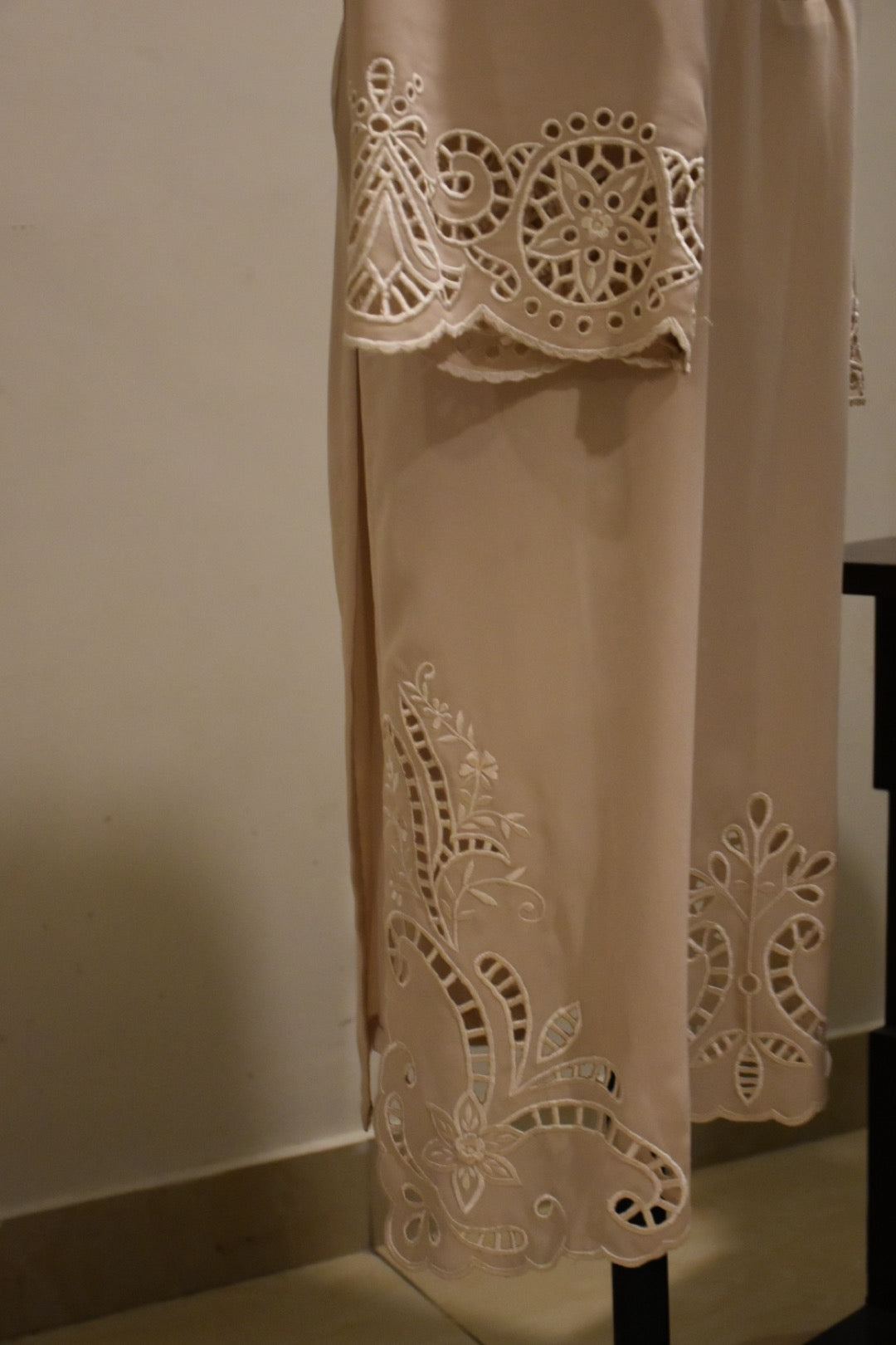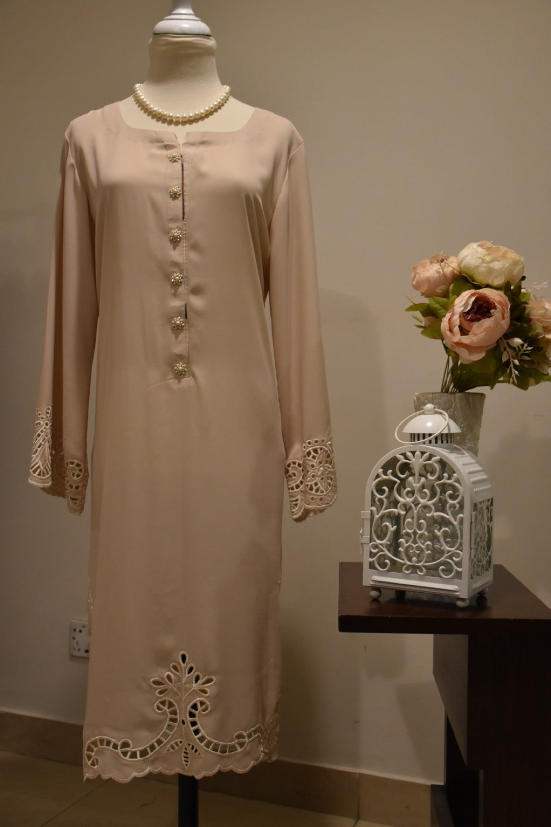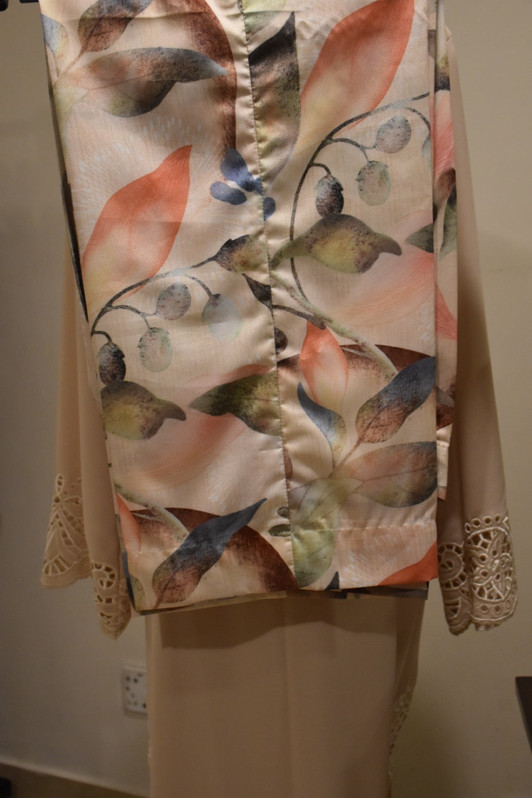 ‘3’ Piece Stitched Outfit. Beige georgette shirt with cut work on pants and hand work on neckline paired with printed Izaar.